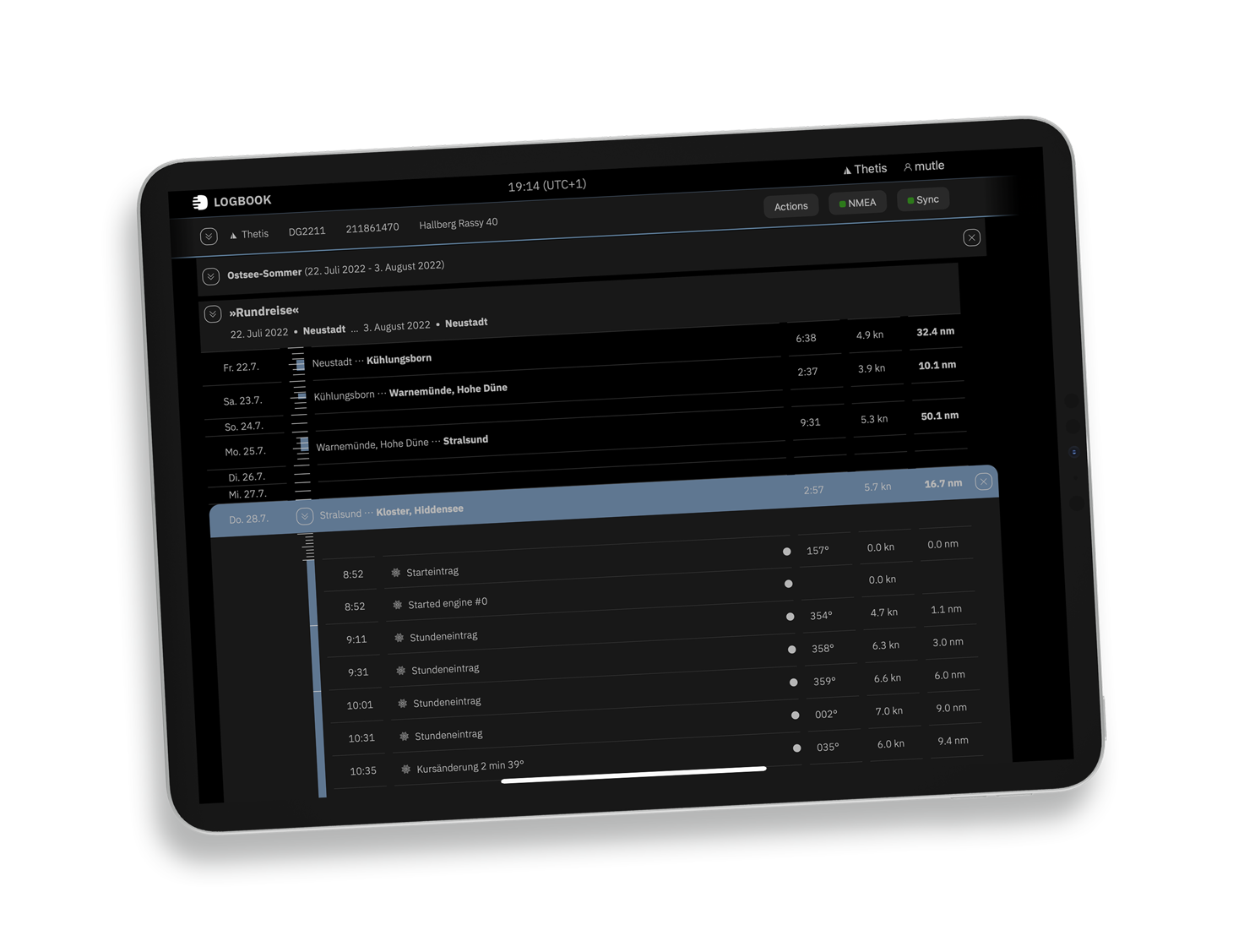 With LOGBOOK's user-friendly interface, which you can configure to your preferences, you always maintain overview. The vertically oriented timeline provides orientation and helps quickly locate current and past days, trips, and cruises. Colored markers highlight your onboard activities.